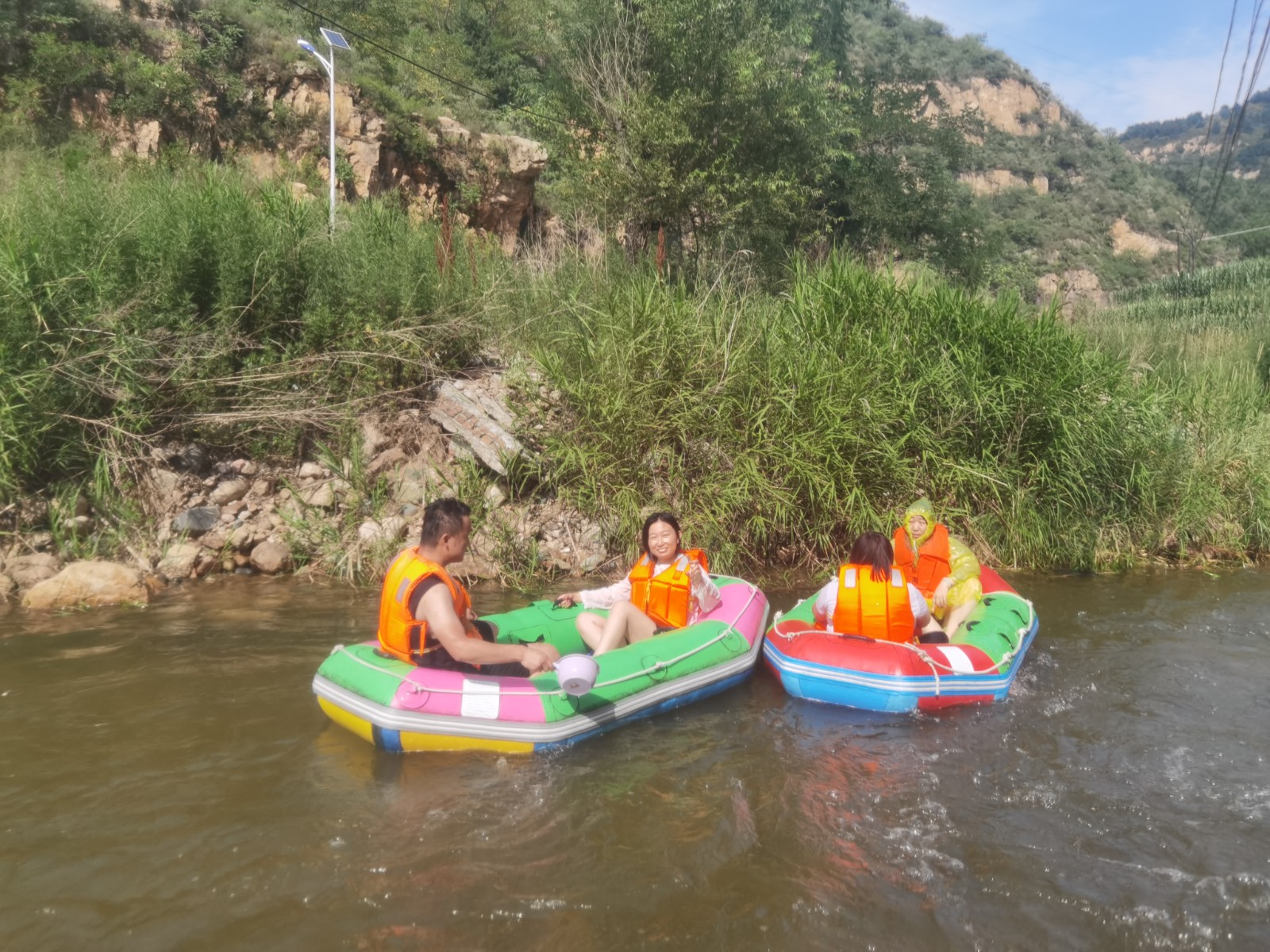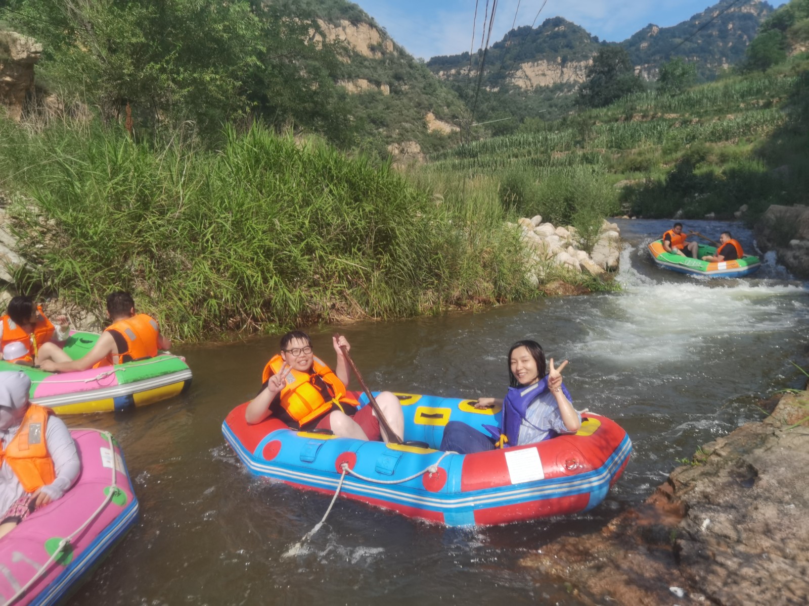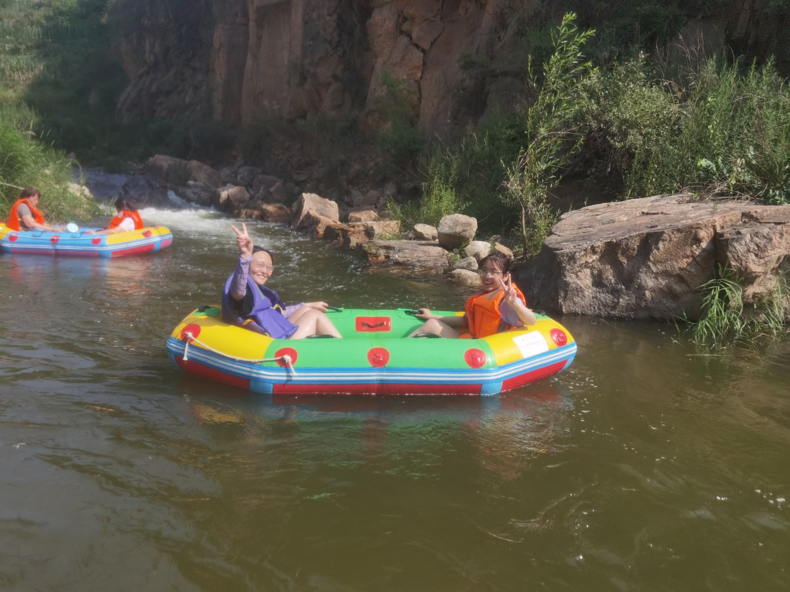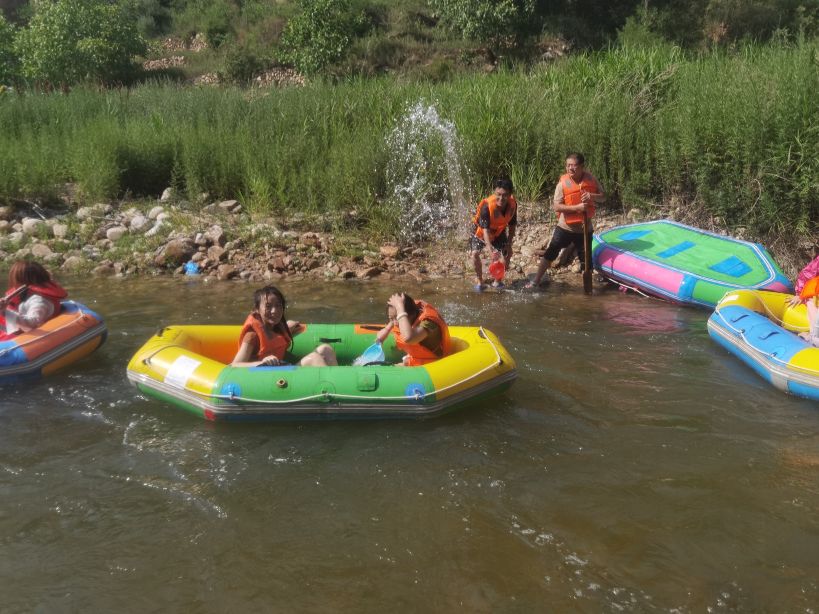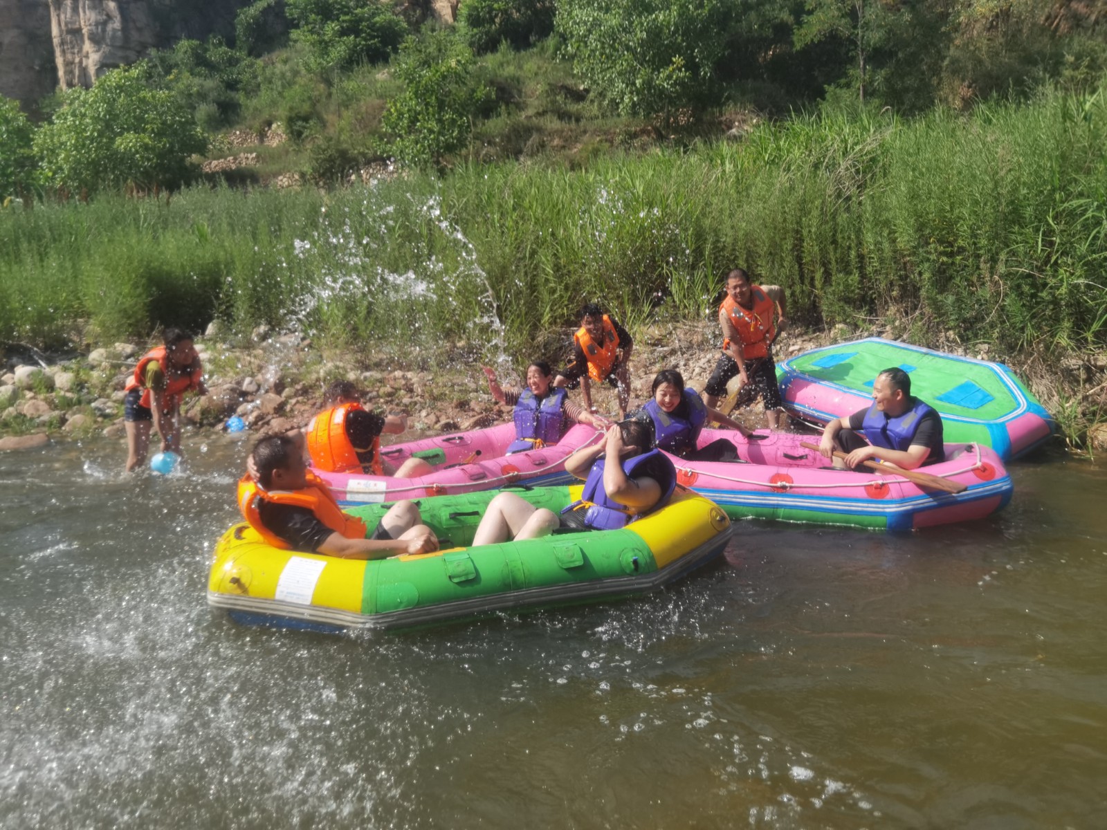 等來(lái)到流速不快的淺灘時(shí),大家卸下緊張和疲憊,或躺或坐在船上,愜意地曬起了日光浴。還有的在河里打起了水仗,一時(shí)間水花翻飛,戰(zhàn)況激烈。清涼的河水刺激著每一個(gè)人的神經(jīng),尖叫聲、歡笑聲響徹整個(gè)河谷,盛夏的炎熱和身心的疲憊也在此刻煙消云散。