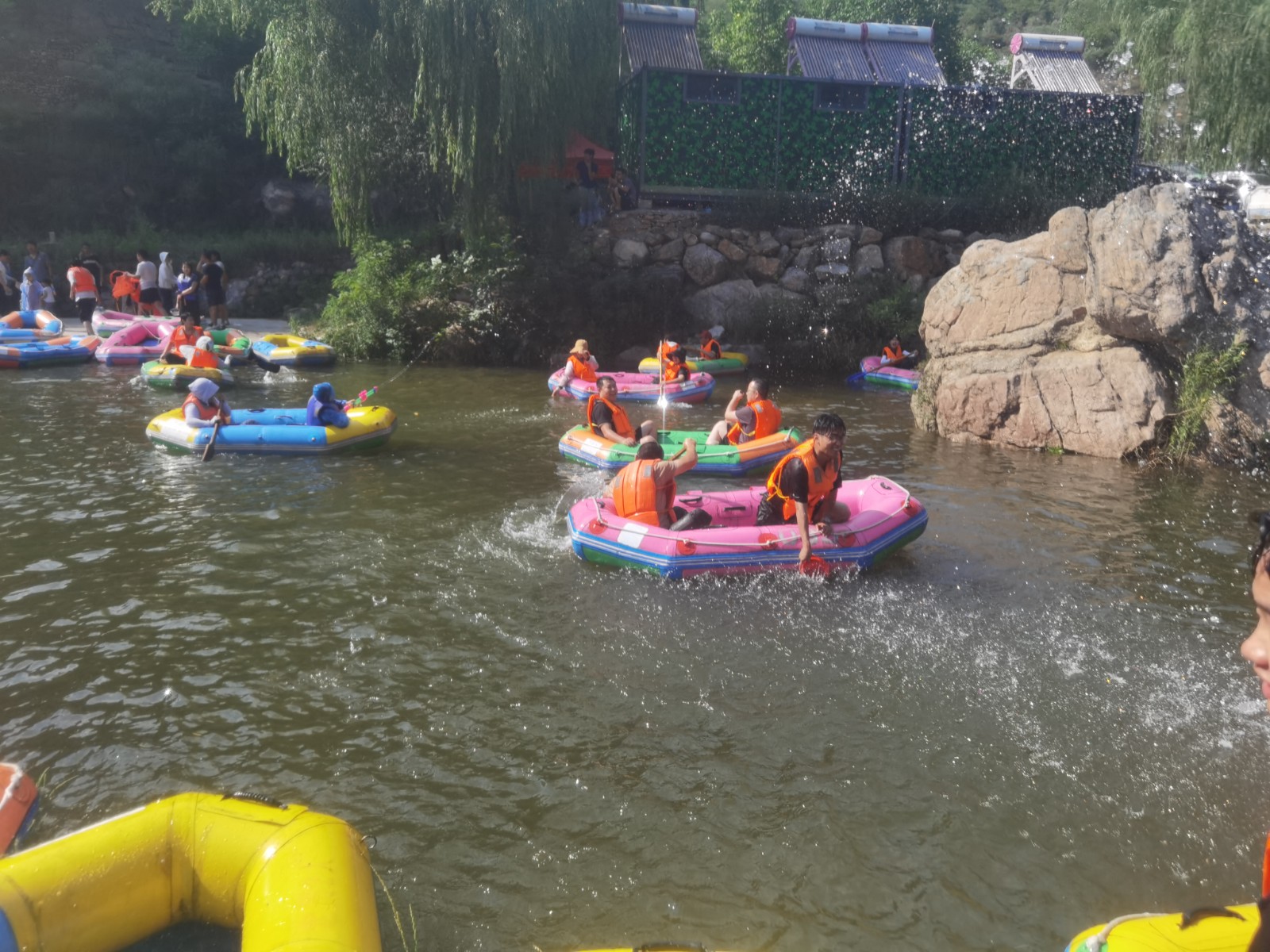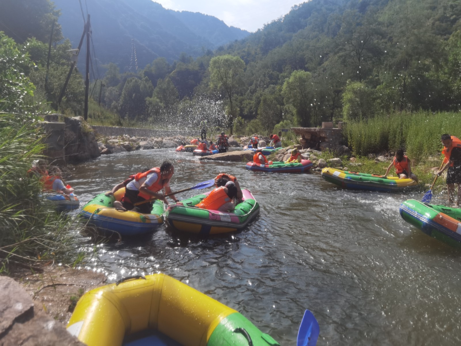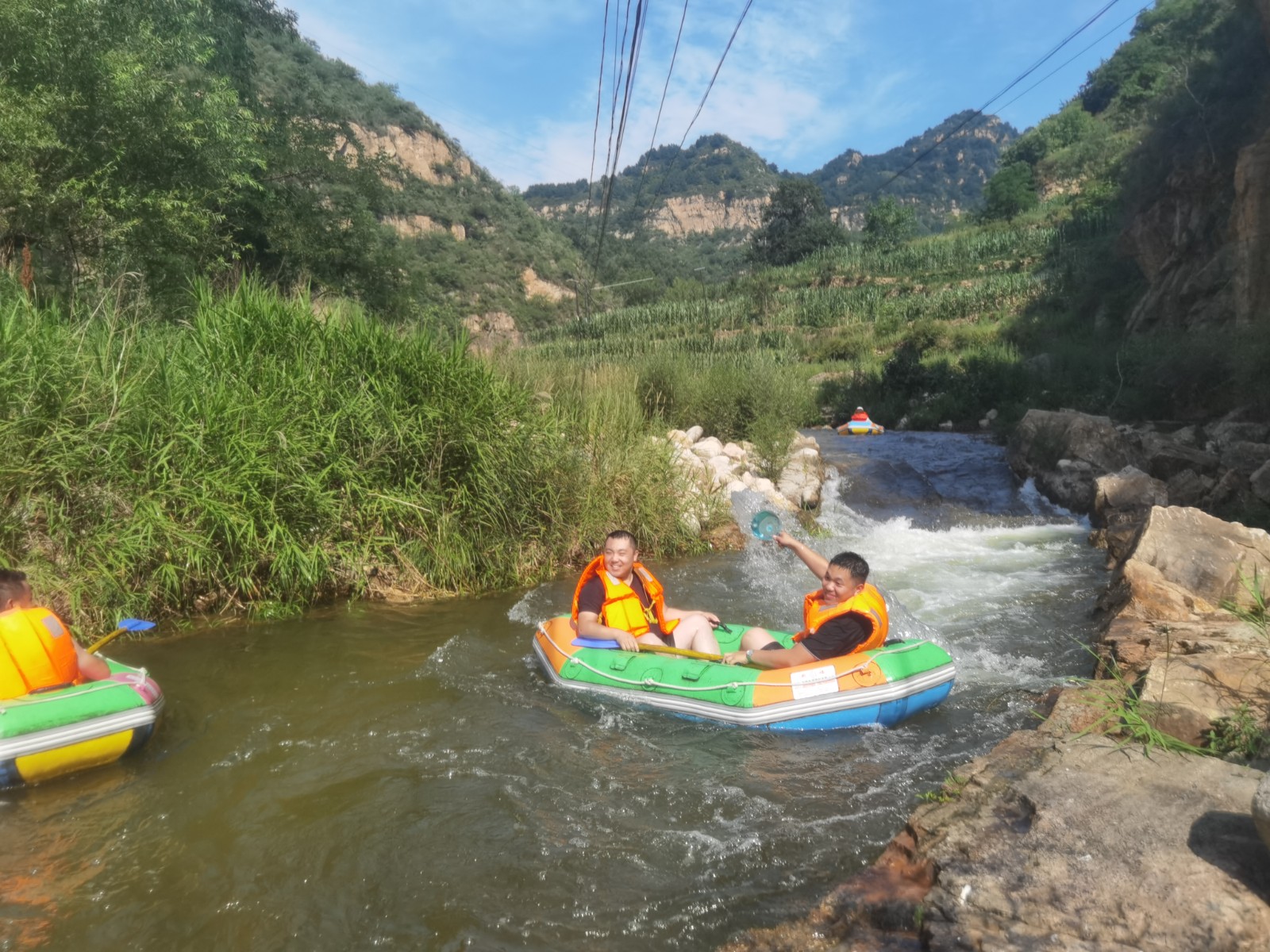 隨著工作人員將漂流筏推向出發(fā)高地,河中頓時(shí)水花四起,一聲接一聲尖叫和歡呼不絕于耳,剛出發(fā)就已是激情滿滿。
