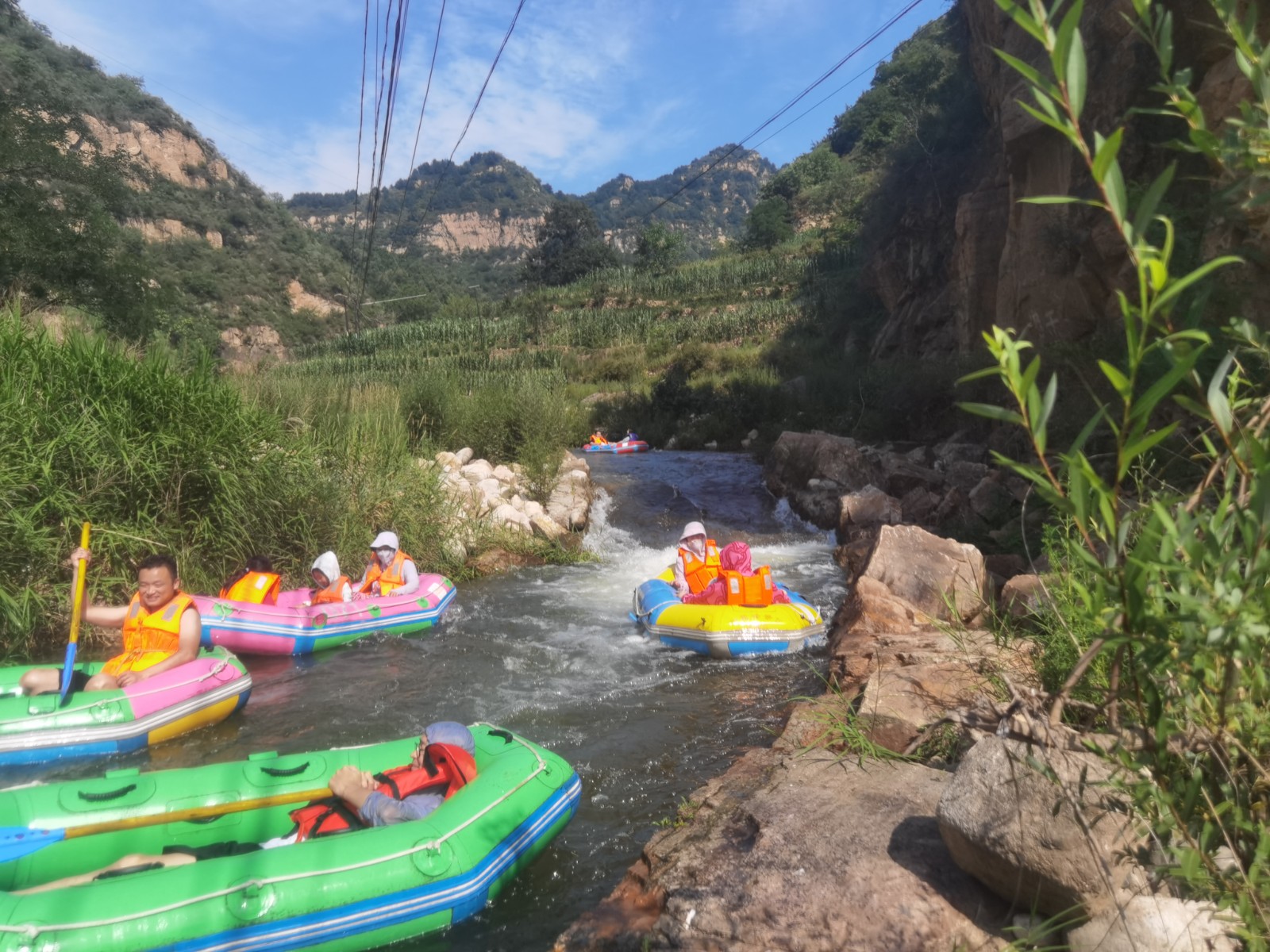 隨后大家來(lái)到農(nóng)家院附近就餐,大家津津有味地品嘗著地道的農(nóng)家菜肴,為下午緊張刺激的漂流活動(dòng)補(bǔ)充能量。一番小憩過后,就直奔蒼鷺峰漂流景區(qū),大巴行駛在山間的小路上,沿途天朗氣清,碧空如洗,山巒聳翠,大家無(wú)不沉浸在這怡人的景色中,頓感心情舒暢。