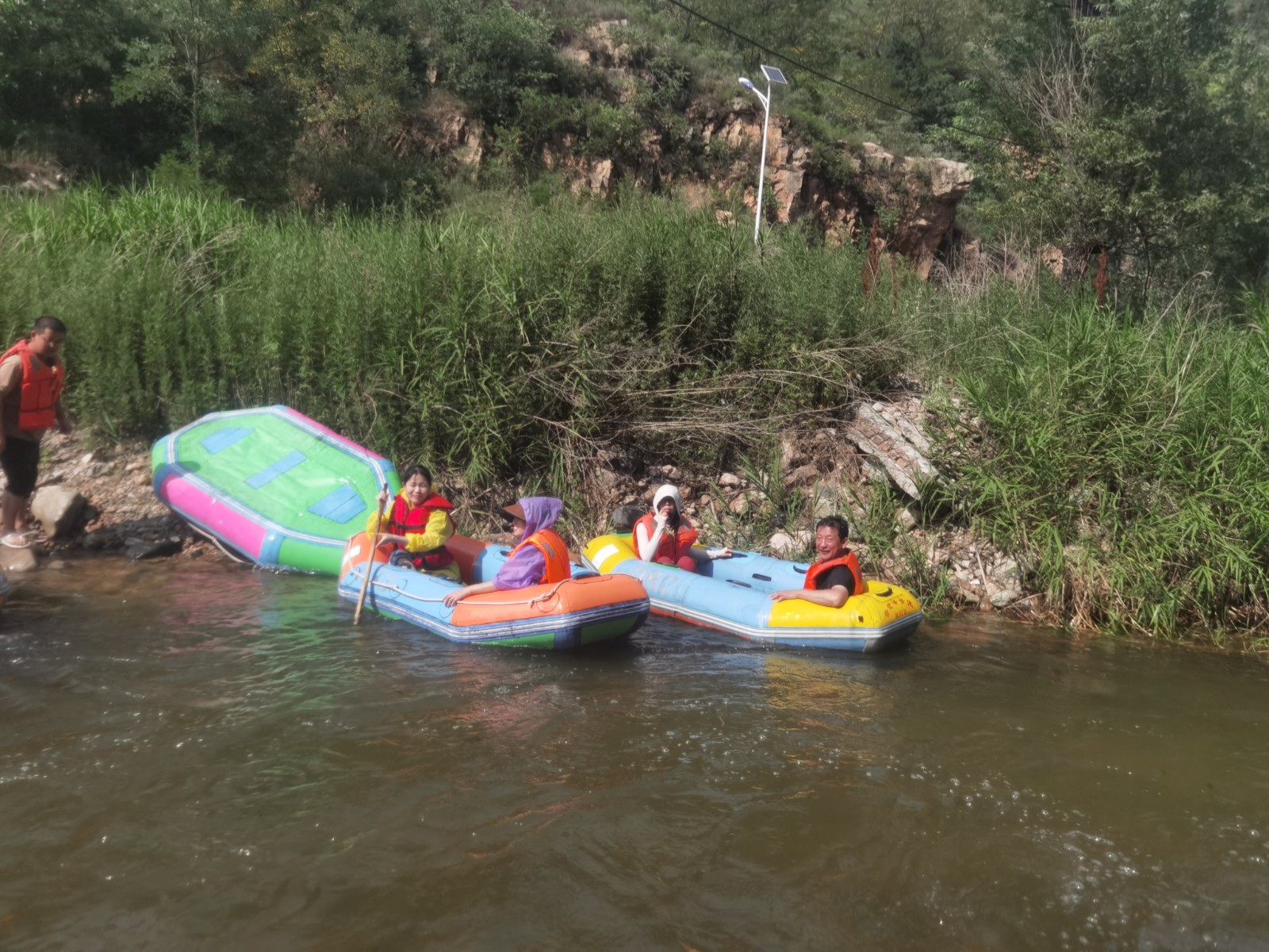 到達(dá)漂流區(qū)后,大家一個(gè)個(gè)摩拳擦掌、躍躍欲試,迫不及待想要體驗(yàn)一番。迅速戴好安全帽與救生衣,兩人一組,全副武裝,排隊(duì)等待緊張刺激的漂流之旅。